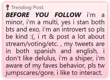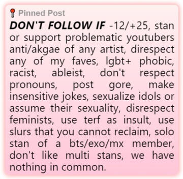 (mucho texto para que cuadrara con el tamaño de la carrd, pero en resumen, se un ser humano decente pls) +25 o -12, staneas youtubers cancelados, anti/akgae de cualquier artista, no te gustan mis favs :/, eres lgbt+ fóbico, racista, capacitista, no respestas pronombres, publicas gore o bromas relativas a violencia :(, eres shiper delulu, no respetas el feminismo, usas slurs que no te corresponden, eres solo stan de algun miembro de bangtan/exo/monsta x, no te gustan los multifandom :/